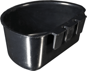 Great feed cup for use in keep stalls or single bird pens. Can be used for temporary water cup also, but average sized American game chickens need one pint of water a day in the hottest part of the year. Hangs on wire or other thin material and is 4.625" wide x 3.25" front to back x 1.875" deep and holds 8 ounces of water. Made in the USA.