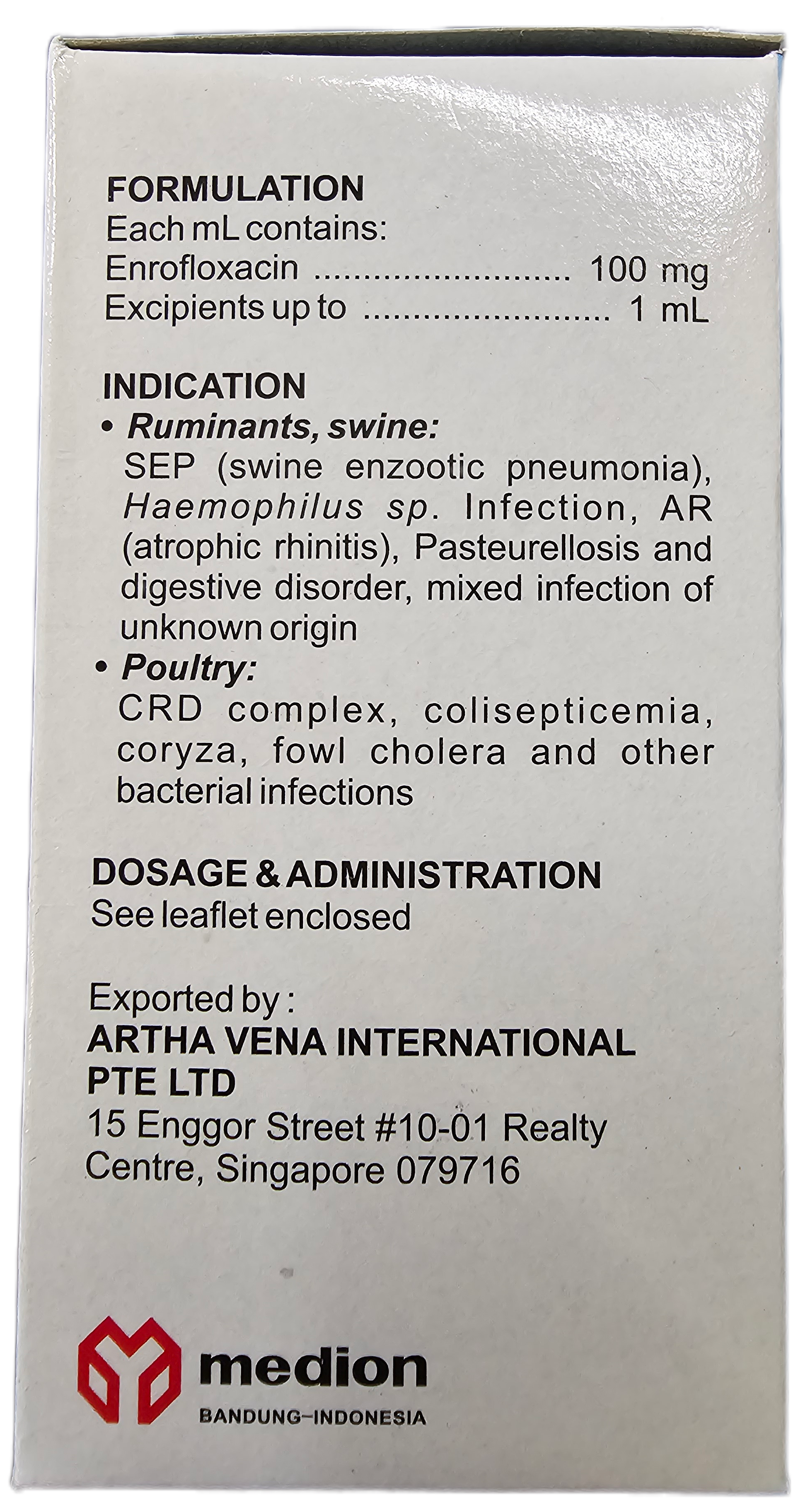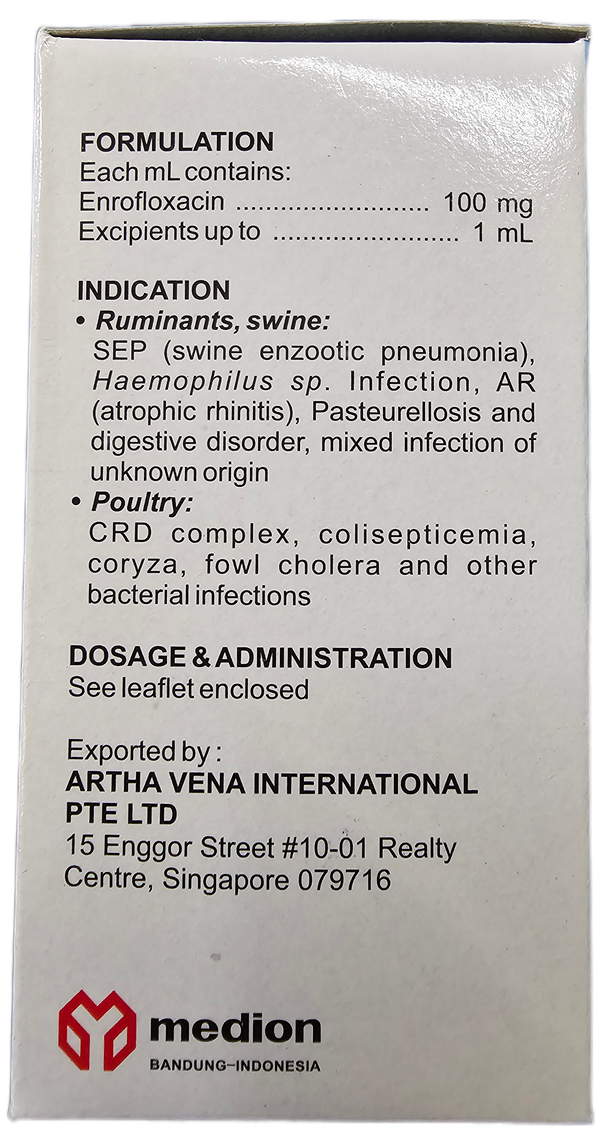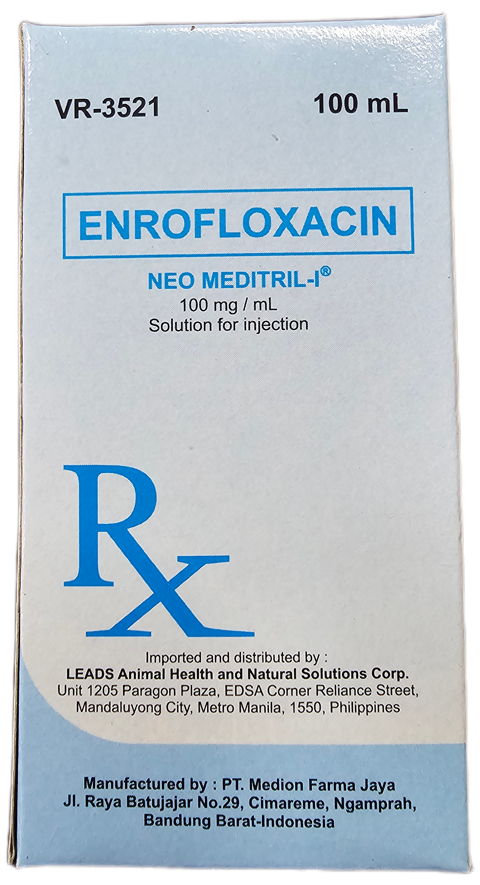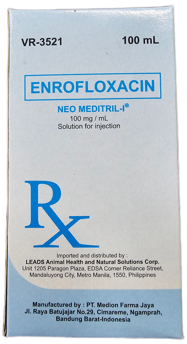 Uses: Typically enrofloxacin is used for difficult-to-treat infections, including those affecting the respiratory tract, urinary tract, and skin. It is effective against a wide range of bacteria, including E. coli, Salmonella, Pseudomonas aeruginosa, and Staphylococcus species.