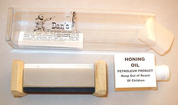 4"x1"x1/4" four Arkansas stone, coarse, med., fine & x-fine with wooden end block guides & 1 oz. honing oil. This is the same as the 3 stone model, except that it also has an extra fine translucent stone for the 4th stone (the most expensive of the grades of Arkansas stone).