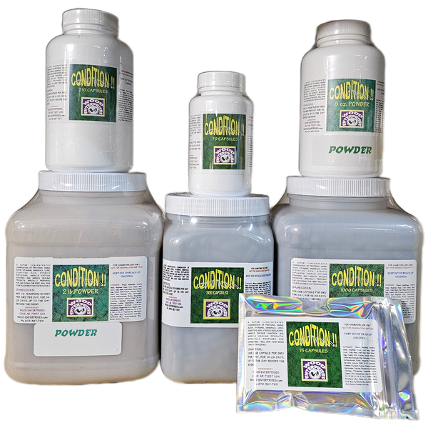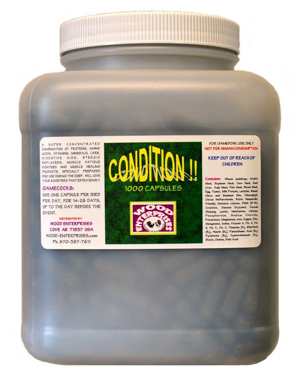 CONDITION!!™ THE ULTIMATE IN NUTRITION Contains - - Wheat middlings, alfalfa meal, soybean meal, corn meal, beef liver, kelp meal, fish meal, blood meal, egg, yeast, milk protein, lecithin, calcium, phosphorus, dextrose, gelatin, distillers grains and solubles, N,N dimethylglycine (B-15), wheat germ & soybean oils, lactobacillus fermentation product, creatine, gamma oryzanol (steroid substitute), Korean ginseng, citrus bioflavonoids, hesperidin, rutin, concentrated chlorophyll, superoxide dismutase, vit. A, vit. C, vit. D-3, vit. E, thiamin, biotin, vit. B-12, riboflavin, d-pantothenic acid, niacin, choline, pyridoxine, beta carotene, MSB (vit. K), iodine, folic acid, manganese, copper sulfate, zinc, cobalt, lysine, d1-methionine, potassium, and sulfur. This vitamin, mineral, protein, amino acid, enzyme, and natural food supplement, will complete your bird's diet and help provide that extreme vigor needed for show day.